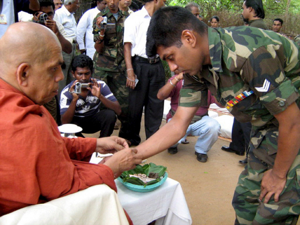 2008년 9월20일 스리랑카 수도 콜롬보에서 북쪽으로 247km 떨어진 바부니야 지역의 군부대에서 한 승려가 정부군 병사의 손목에 축복을 상징하는 실을 매주고 있다. EPA/ STR