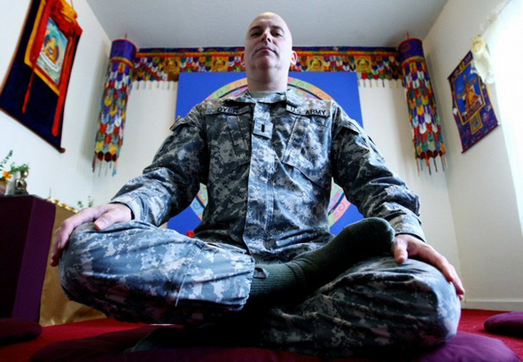 미군 사상 최초이자 유일한 군법사인 토머스 다이어 군종 장교가 참선을 하고 있다. 그는 이라크 파병에 앞서 “불교의 기반은 평화주의지만, 전쟁은 평화의 필수적 요소 가운데 하나”라고 말한 바 있다