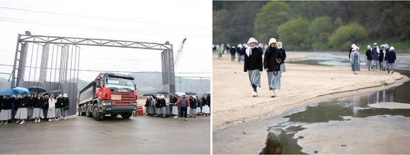 순례 첫날인 4월19일 들른 함안보 준공 현장. 쉴 새 없이 오가는 덤프트럭 사이에서 수녀들은 위태로워 보였다(왼쪽). 순례 사흘째, 한반도 강의 원형을 간직하고 있다는 내성천의 드넓은 모래톱을 순례단이 거닐고 있다. 이곳에 남긴 발자국도 영영 사라질 것이다.