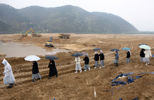 4대강이 수도자까지 불러세웠다. 죽음의 소리가 겨우 전해진 것일까. 이날 남지 준설 현장에서 기도문을 함께 되뇐 수녀와 수사만 150여 명이다. 한국 가톨릭 베네딕도회 수도자다. 전례를 찾기가 어렵다. 대부분 세속과의 접경을 최소화하며 기도와 수행을 삶의 중심에 놓는 이들이다. ‘봉쇄 수도원’(외출 없이 기도·독서·노동으로 이어지는 안거와 피정만 함)의 수녀들도 포함돼 있다.