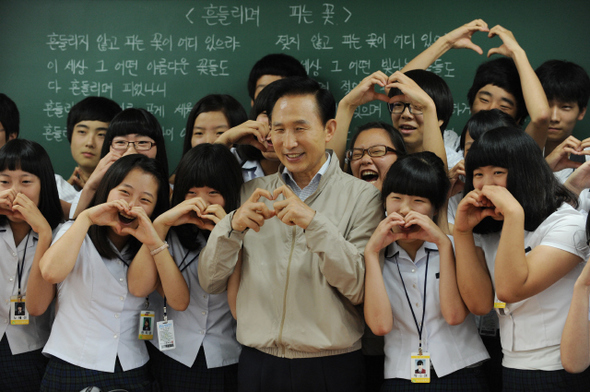 2009년 7월 이명박 대통령이 농산어촌 기숙형 고등학교인 충북 괴산군 괴산고등학교를 방문, 보충수업 참관을 마치고 학생들과 기념촬영을 하며 ‘사랑’ 표시를 하고 있다. 청와대사진기자단