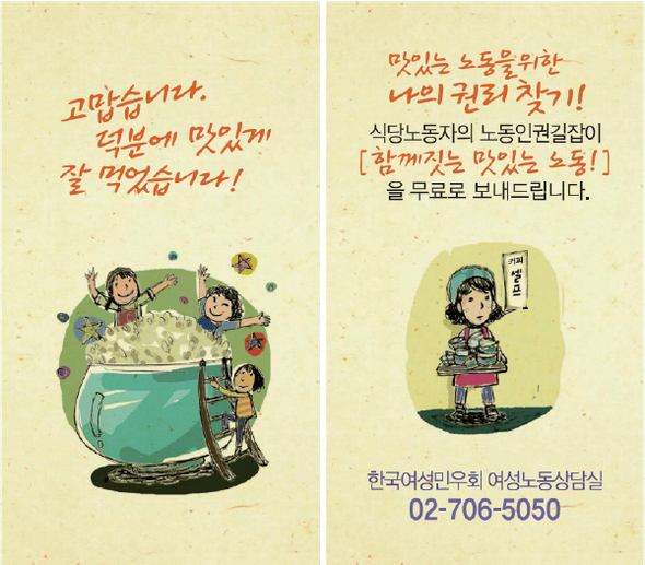쪽지의 뒷면에는 ‘책 광고’가 실려 있다. <식당 노동자들의 노동인권 길잡이- 함께 짓는 맛있는 노동!>이란 제목의 소책자다. 여성민우회는 식당 여성 노동자들이 꼭 알아야 할 노동인권 상식과 건강 정보를 담아 책자를 발행했다. 건강 자가진단법부터 노동환경 진단법, 근로계약서 작성법, 최저임금·퇴직금·각종 수당 관련 정보, 산재 신청 방법, 성희롱 대처법 등이 빼곡하다. 여성민우회 여성노동팀에 전화(02-737-5763)하거나 전자우편(