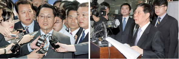 2003년 6월16일 박지원 전 문화관광부 장관이 대북송금 특검 사무실에 출석하고 있다. 한겨레 황석주 기자(왼쪽). 2008년 2월21일 정호영 특별검사가 이명박 당선자에 대한 모든 의혹은 무혐의라는 수사 결과를 발표하고 있다. 한겨레21 박승화 기자