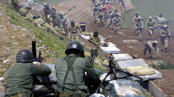 ‘지평리 전투 재현행사’ 열린 경기 양평군 지평면 지평리에서 26일 오전 20사단 병사들이 지평리전투를 재현하고 있다. 지평리전투는 지난 1951년 2월 미 23연대 전투단에 배속된 프랑스군 1개 대대가 중공군 3개 사단 3만여명과 싸워 승리한 전투다. 한겨레 김명진 기자