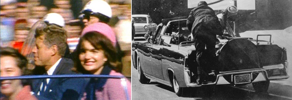표현의 자유가 보장됐기에 케네디를 둘러싼 숱한 음모론도 가능했다. 암살당하기 직전의 케네디 부부(왼쪽). 저격 직후 경호원이 대통령에게 다가가려 애쓰는 모습. 연합