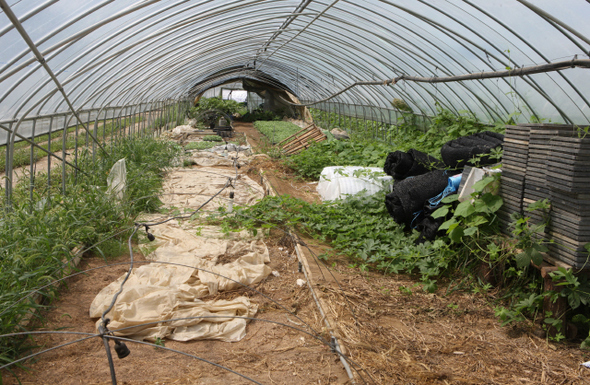 한강을 거슬러 올라가보면 상황은 더 안 좋다. 15만 평 규모에 40가구가 농사를 짓고 있는 경기 남양주시 조안면 인근 유기농 단지. 이흥교(70) 할아버지의 비닐하우스를 찾았다. 40가구 가운데 28가구 농민들은 지난 8월말 “9월9일까지 자진 철거를 하지 않으면 200만원 이하의 벌금과 행정대집행 비용을 청구한다”는 내용의 1차 계고장을 서울지방국토관리청으로부터 받았다. 국토청은 지난 7월 말 이들에 대한 보상금 17억원을 법원에 공탁했다. 조만간 철거를 진행할 계획이다. 이흥교 할아버지는 철거 소식에 마음을 못잡고 있다. 할아버지가 자리를 비운 사이 비닐하우스에는 부인 구순자(69) 할머니만 깻잎을 따고 있다. 부부는 이곳 10동 정도의 비닐하우스에서 2천 평이 조금 넘는 땅에 농사를 짓고 있다.