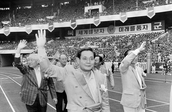 이건희 삼성그룹 회장의 “마누라와 자식들 빼고는 다 바꿔라”는 말은 지구화 시대의 ‘가르침’이 되었다. 서울 잠실운동장에서 열린 ‘삼성가족 한마음 축제’에 참여한 이회장과 임원들.한겨레 강창광