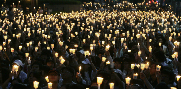 약속된 시간에만 분노하고 차분한 일상으로 돌아가는 ‘촛불의례’는 예배의 형식과 닮았다. 2008년 미국산 쇠고기 수입에 반대하는 촛불집회에 참여한 시민들.한겨레 김진수