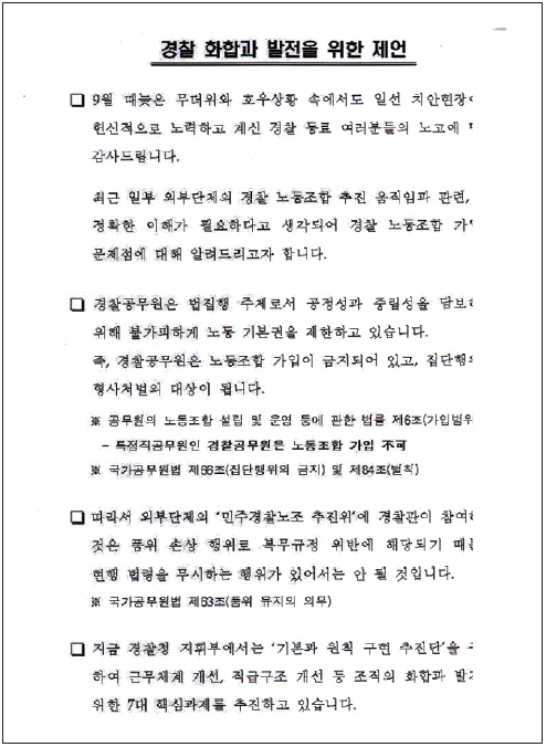 지난 9월28일 전국의 경찰서 내부 인터넷 게시판에는 “경찰공무원의 노조 가입 금지”와 “이를 어길 시 형사처벌의 대상이 된다”는 내용이 ‘경찰 화합과 발전을 위한 제언’이라는 제목으로 올랐다.