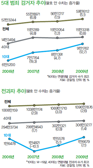 10대 전과자(14~19살) 수도 늘고 있다. 2008년 1만5578명에서 2009년 1만6679명으로 전년 대비 7.1%가 늘었다. 전체에서 가장 많은 비중을 차지하는 40대는 302만321명에서 306만3277명으로 1.4% 늘었다. 9.7%의 증가율을 보인 70대 전과자 다음으로 10대의 증가폭이 크다.