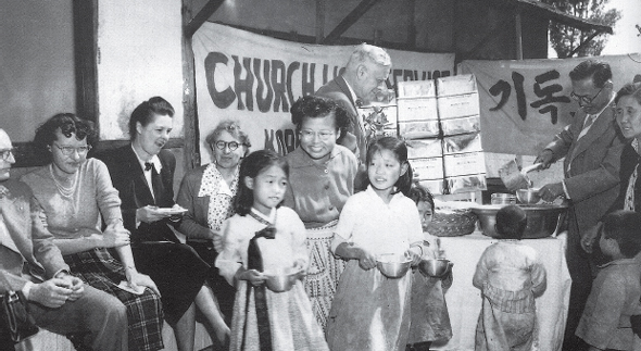 해방 전후의 개신교 신자들은 다른 집단에 견줘 미국에 접근할 기회가 많았다. 1952년 기독교세계봉사회가 나눠준 음식을 받고 있는 어린이들.한겨레 자료