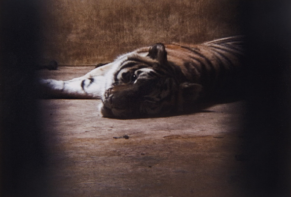 국내의 한 동물원에서 어두운 내실에 힘없이 누워 있는 호랑이 ‘홍아’. 동물원에 갇힌 야생동물의 삶에 관한 다큐멘터리 영화 <작별>의 한 장면이다.황윤 제공