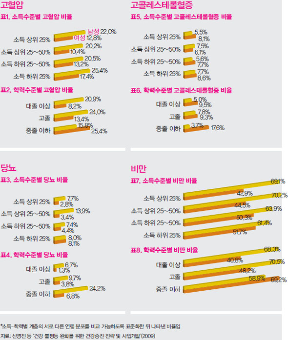 <한겨레21>이 입수한 보건복지부의 ‘건강 불평등 완화를 위한 건강증진 전략 및 사업개발’ 용역 보고서를 보면, 학력·소득과 고혈압, 당뇨, 고콜레스테롤혈증, 비만, 주관적 건강상태, 흡연, 음주 등의 상관관계가 광범위하게 분석됐다. 보고서는 1998~2007년 네 차례에 걸쳐 정부가 실시한 ‘국민건강영양조사’를 기초자료로 활용했다. 하나씩 살펴보자.