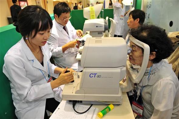 2008년 서울 삼성동 코엑스 대양홀에서 열린 성인병 박람회에서 방문자들이 시력검사를 하고 있다. 고혈압·당뇨 등의 질환은 학력·소득과 일정한 상관관계를 나타냈다.한겨레 자료