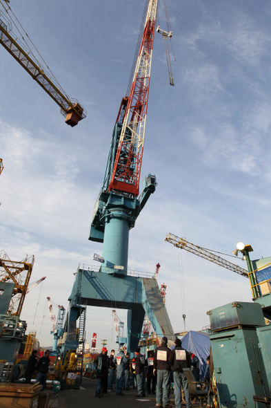 지난해 12월15일 회사 쪽의 구조조정안이 발표되자 한진중공업 노조는 12월20일부터 무기한 총파업에 돌입했다. 1월11일 한진중공업 부산 영도 조선소 85호 크레인 앞을 파업 노동자들이 지키고 있다. 8년 전 이 크레인에서 김주익 노조지회장이 129일 동안의 점거농성 뒤 스스로 목숨을 끊었다. 한겨레 정용일 기자