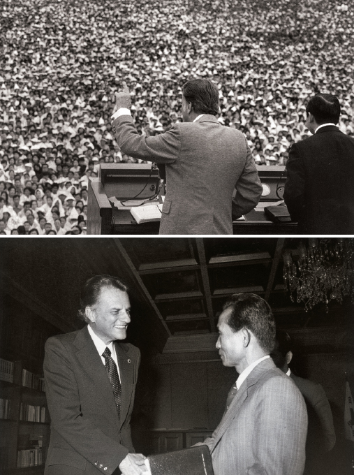 빌리 그레이엄의 방한은 한국 교회사의 중요한 사건이었다. 1973년 5월 그레이엄 목사는 서울 여의도 부흥집회를 이끌고(위), 박정희 대통령도 만났다.대한민국 정부기록 사진집(위)/대한민국 정부기록 사진집(아래)