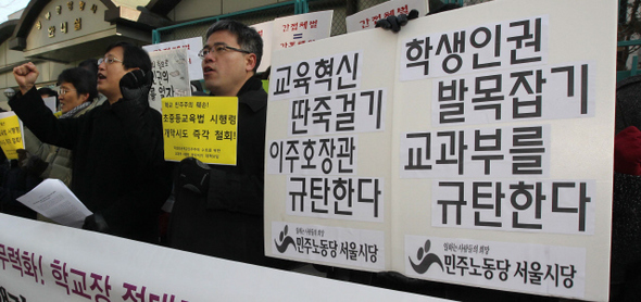 지난 1월20일 ‘학생인권·학교민주주의 수호를 위한 교과부 시행령 개악 저지 대책모임’이 서울 정부종합청사 앞에서 교육과학기술부의 초·중등교육법 시행령 개악 규탄 기자회견을 열고 있다. 한겨레 박종식 기자 anaki@hani.co.kr
