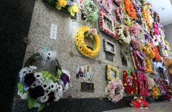 폐암을 앓던 최효인 할머니는 지난 1월22일 성가복지병원에서 세상을 떠났다. 그의 유골은 1월24일 경기 파주시 용미리 시립 ‘추모의 집’ 2층에 자리를 잡았다. 왼쪽 끝 밑에서 두 번째 봉안단 자리에 최 할머니의 이름이 적힌 종이가 붙어 있다. 한겨레 정용일 기자 yongil@hani.co.kr