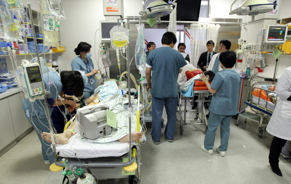 지난해 11월 경기 수원시 아주대병원 응급실에서 의료진이 환자를 살펴보고 있다. 우리나라의 한 해 중증 외상 사망자 2만8천여 명 가운데 적절한 응급치료로 죽음을 막을 수 있었던 경우는 9천 명이 넘을 것으로 추정된다.한겨레 정용일 기자 yongil@hani.co.kr