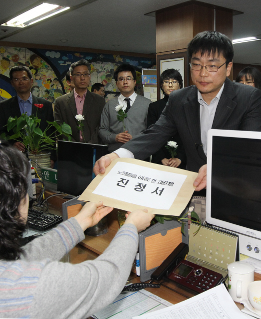 전국공무원노동조합 국가인권위원회지부 심광진 위원장이 8일 오전 서울 종로구 무교동 국가인권위원회 인권상담센터에서 노조 간부로 활동해 온 일반계약직 공무원과 계약을 연장하지 않는 것은 ‘노조 활동을 이유로 한 고용상의 차별‘ 이라며 진정서를 접수하고 있다. 한겨레 신소영 기자 viator@hani.co.kr