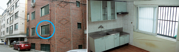 서울 송파동에서 본 보증금 1억1천만원짜리 전셋집(원 안)과 집 내부의 주방 겸 거실.한겨레21 최성진