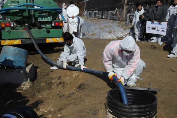 지난 2월21일 경기 남양주시의 돼지 구제역 매몰지에서 경기도 공무원들이 돼지 사체로부터 나온 침출수를 수거하고 있다.한겨레 김태형