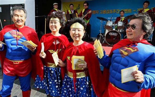 2008년 10월28일 서울 종로구 인사동에서 열린 노동부 주관 고령자 고용촉진 캠페인에서 슈퍼맨과 원더우먼 복장을 한 실버 모델들이 실버 밴드의 반주에 맞춰 경쾌한 춤을 선보이고 있다.연합