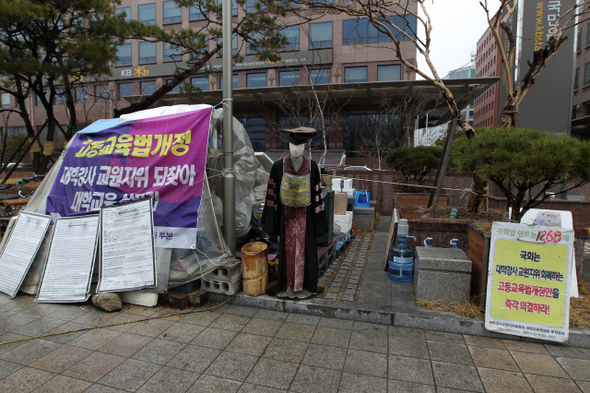 서울 여의도 국민은행 앞. 국회 본관이 위엄을 드러내며 굽어보는 길옆으로 남루한 천막 하나가 서 있다. 천막 옆 학사모를 쓴 마네킹에는 고등교육법 개정으로 대학강사의 교원 지위를 회복해 대학 교육을 정상화하자는 손팻말이 걸려 있다. 비닐을 열고 허리를 굽혀 안을 들여다보니 초로의 부부가 환하게 손님을 맞는다. 노동운동가 출신으로 대학에서 한국노동사를 가르치는 김영곤(63)교수와 중국근대사를 전공한 전 한성대 대우교수 김동애(65)씨다. 그들은 무려 1271일 동안 이 천막을 지켜왔다. 이 부부는 무엇을 위해 천막에서 네 번째 겨울을 나고 있는 걸까?