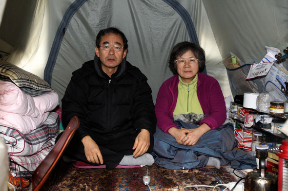 지난 3월1일 서울 여의도 국회 본관 앞 천막에서 시간강사인 김영곤(63·왼쪽)씨와 김동애(65) 전 한성대 대우교수가 앉아 있다. 이 노부부는 시간강사 교원지위 회복과 대학교육 정상화를 위해 4년째 천막농성을 하고 있다.