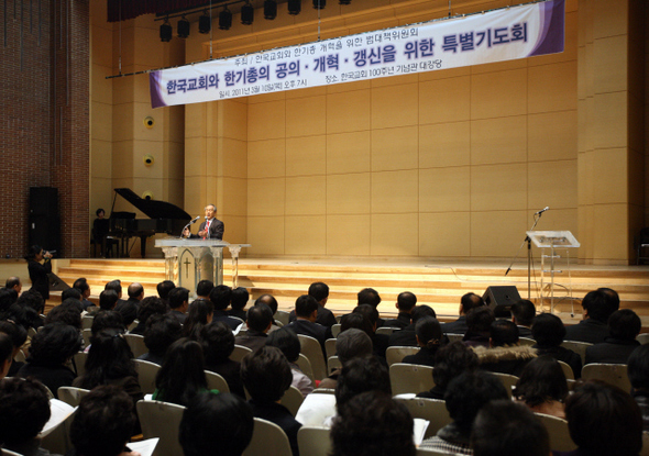 지난 3월10일 저녁 7시 서울 종로구 연자동 한국교회100주년기념관에서 ‘한국 교회와 한기총 개혁을 위한 범대책위원회’가 한기총 개혁을 촉구하는 특별기도회를 열고 있다.한겨레21 정용일