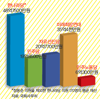 지난 3월25일 국회사무처는 18대 국회의원들의 지난해 재산을 공개했다. 정몽준 한나라당 의원은 3조6708억원의 재산을 신고했다. 압도적인 1위였다. 반면 김창수 자유선진당 의원은 1억566만원을신고해 가장 ‘가난한’ 의원이었다. 정당별 국회의원 평균 재산은 그래프와 같다.