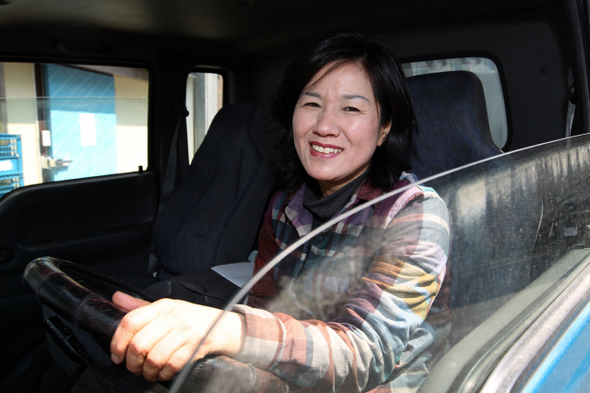 봉주영씨는 해고 뒤 한 번도 손에서 일을 놓은 적이 없다. 아이들을 키우면서도 새벽에 우유 배달, 낮엔 요구르트를 배달하며 동네 세탁소, 24시간 슈퍼마켓 등 닥치는 대로 일을 찾아서 했다. 지난 3월30일 배달을 하려고 우유대리점 트럭에 오른 그가 밝게 웃고 있다.