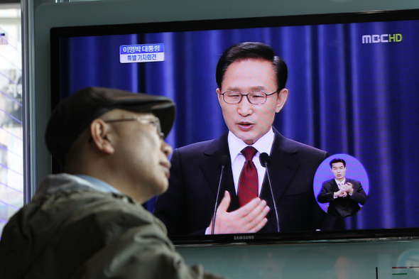 1일 오전 서울역에서 시민들이 이명박 대통령의 신공항 관련 대국민 담화문 발표를 지켜보고 있다. 한겨레21 류우종 기자