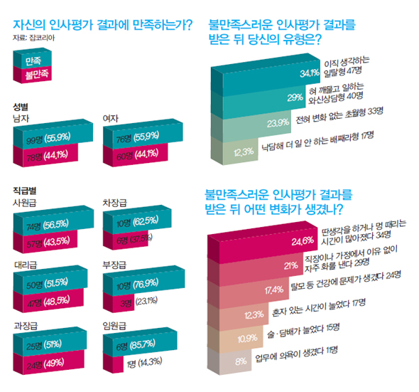 인사평가에 속 쓰려 한 이들의 정신적 외상은 다양한 형태로 나타났다. ‘딴 생각을 하거나 멍 때리는 시간이 많아졌다’(34명·24.6%), ‘직장이나 가정에서 이유 없이 자주 화를 낸다’(29명·21%), ‘소화불량·탈모 등 건강상의 문제가 생겼다’(24명·17.4%), ‘혼자 있는 시간이 늘었다’(17명·12.3%), ‘술·담배가 늘었다’(15명·10.9%). 잡코리아의 정주희 대리는 “직장인들이 인사평가 시스템을 불신하는 데는 주로 위에서 아래로 내려오는 수직평가가 많기 때문”이라며 “상당수 회사들이 실적에 대한 인센티브 등 보상을 주는 시스템인데, 고과를 잘 받지 못한 사람에 대한 ‘케어’도 필요하다. 일부 업체에서는 이런 방식을 도입하기 시작했다”고 말했다.