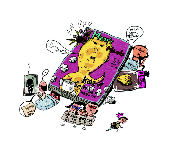 2주 뒤 TV의 ‘뉴스 추격’ 시간에 S형이 등장했다. 아나운서는 우리 사회의 섹스리스 문제가 심각해 결국 성적소수자가 커밍아웃 운동을 하는 사태에까지 이르렀다고 전했고, S형은 자신 있게 주장을 펼쳤다. “말이 성적소수자지, 실제로는 우리 사회의 다수일 수도 있습니다. 일본에서 나온 <중년동정>이라는 책을 보면 40대 초반 남성 중 10% 정도가 성경험이 전혀 없다고 합니다. 3D(실제 여성)와 관계를 맺기보다 2D(비디오·잡지 등의 성인물)에 의존하는 거죠. 우리나라도 이와 비슷해진다고 생각하는데요. 문제는 독신자만이 아닙니다. 행복가정연구소, 한국성과학연구소 등에서 진행한 여러 조사를 보면 40대 부부 4쌍 중 1쌍이 한 달에 한 번도 관계를 맺지 않는다고 해요.” 성적소수자 단체 ‘옆반 사이’ 개설 “성적소수자들의 처지가 딱한 건 알겠는데, 도대체 어떤 조치를 원하시는 겁니까?” “우리는 소수자를 4단계로 구분합니다. 최근 1년간 한 번도 못한 4등급, 3년간 한 번도 못한 3등급, 10년간 한 번도 못한 2등급, 그리고 태어나서 한 번도 못한 1등급. 우리는 이 등급에 따라 주민센터에서 성인영화 동반관람권, 데이트 알선업체 등록권, 러브호텔 숙박권 등을 주는 혜택이 이루어지기 바랍니다. 어려운 처지에 있는 사람들에게 여러 가능성을 부여하는 거죠.” “사실 1등급인 중증소수자는 자체적으로 해결이 어렵지 않습니까?” “솔직히 그렇죠? 그들에게는 스티커를 발부해 장애인 구역에 주차할 수 있다든지 하는 혜택을 주었으면 합니다.” “그런데 그 사람이 안 했다는 건 어떻게 증명합니까?” 날카로운 질문에 S형은 얼버무렸다. “조, 좋은 질문입니다. 그러니까… 소수자 실태를 연구하기 위한 사업에 정부 차원의 지원이 있어야 하고요. 어쨌든 저희는 법이나 제도만이 아니라 문화적으로 성적소수자의 권리가 보장돼야 한다… 그러니까 <색즉시공> 같은 영화를 보면 동정인 남자를 멸시한다든가, 자위 행위를 부끄러워하는 장면이 나오지 않습니까? 이런 것은 분명히 시정돼야 합니다.” 방송 이후 성적소수자 운동을 적극적으로 지지하는 세력들이 윤곽을 드러냈다. 40~50대 주부들이 모인 ‘각방살이 자매단’은 부부생활을 소홀히 하는 남편들에게 ‘합방 청구서’를 발송하고, 불이행시 대대적인 위자료 소송에 나설 것임을 천명했다. 30~40대 남성이 중심이 된 ‘기러기 부대’도 자의 반 타의 반으로 결성됐는데, 부인과 자식을 해외로 보낸 남편들이 본인의 순결을 증명하는 차원에서 커밍아웃하게 된다. “우리는 매일 밤 부인의 사진을 보고 외로움을 달랠 뿐, 회식 이후 2차 등 불건전한 행동을 절대 하지 않았음을 맹세합니다.” 1등급 동정의 남성들이 대거 소속된 ‘미연시(미소녀 연애 시뮬레이션) 클럽’은 성인 매체 및 용품의 수입 자유화와 가상 결혼 합법화 등을 내걸고 의원 로비에 나섰다. 각계의 지지도 줄을 이었다. 알흠다운재단은 ‘손만 잡곤 못살아 펀드’를 만들어, 경제적 문제로 합방에 들어가지 못한 연인을 위한 모텔비를 지원하고, ‘각방살이’ 부부를 위한 침실 환경 개선 사업을 벌이게 되었다. 재단에서 진행하는 청소년 캠프 등에 소수자 부부 자녀를 우선적으로 입소시키는 정책도 큰 호응을 얻었다. 전투적인 젊은 여성들은 ‘초식남 토벌대’를 결성해, 연애에 관심 없고 자기 꾸미기에 바쁜 남성 성적소수자를 해방하는 일에 앞장서기로 했다. 그러나 이들은 잘 꾸미고 다니는 초식남이 해방의 대상이지, 방구석에서 애니메이션 캐릭터와 가상의 결혼 생활을 하는 ‘오덕후’들과 연대할 의사는 전혀 없다고 선을 그었다. 나는 어쩌다 보니 S형이 만든 성적소수자 단체인 ‘옆반 사이’의 간사 일을 하게 되었다. 동성애자들이 스스로를 ‘이반’(this class)이라고 하기 때문에, 섹스리스들은 ‘옆반’(next class)이라고 이름을 붙인 거란다. 내가 이반이 그런 뜻이 아니라고 했지만 상관없단다. S형은 단체 일을 나에게 맡기고 각종 강연과 학습 사업에 뛰어들었다. 계기는 형이 <멘스 핸즈>(Men’s Hands)와 인터뷰하면서부터다. 형은 20여 년간의 동정 생활을 이겨낸 노하우를 상세히 고백했는데, 그달 잡지 표지에 ‘자위왕’(King of Single Sex)으로 소개됐다. 원래 남성 건강 전반을 다루는 잡지인 줄 알았는데, 손의 악력을 전문적으로 단련하는 잡지였던 것이다. 독거노인 성해방 감사패 받기도 이후 형은 <솔로 카마수트라>라는 책을 발간하고, 백화점 문화센터 등에 특강을 나가기 시작했다. 대히트였다. 표절에 가까운 책이 대거 쏟아져나왔고, 전국의 주민센터에서 유사한 강의들이 개설됐다. 처음에는 보수적인 노인 단체들에서 강의장을 부수고 들어오는 등 반대가 있었지만, 형의 현란한 실습을 보더니 열혈 수강생이 되었다. 형은 독거노인들의 성을 해방시켰다는 취지로 감사패를 받았다. S형은 유명세 덕분에 온갖 여자들의 유혹을 받게 되었지만 아직도 꿋꿋이 동정을 지키고 있다. 어떤 의사는 S형이 자기 손과 판타지에 의존하며 실제 여성과 관계할 수 없는 몸이 되었을 것이라고 했다. 어쨌든 몸과 생각이 일치한다는 점은 높이 사줘야 하지 않나? 이명