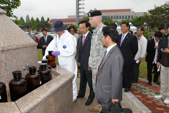 지난 5월27일 오후 경북 칠곡군 왜관읍 미군기지 캠프 캐럴 주변에서 한·미 양국이 지하수 시료를 채취하는 등 고엽제 매립과 관련한 첫 공동조사를 벌였다. 환경오염 사고가 발생할 때마다 비협조로 일관했던 주한미군이 이번에는 ‘동맹국’에 대한 예의와 성의 있는 노력, 진솔한 사과를 보여줄지 주목된다. 한겨레 류우종