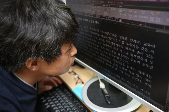 시각장애 1급인 이씨는 컴퓨터 모니터의 바탕을 까맣게 해 글씨를 하얗게 처리해야 보기가 편하다고 한다. 문서를 열어 편집 작업을 하고 있다. 한겨레21 박승화