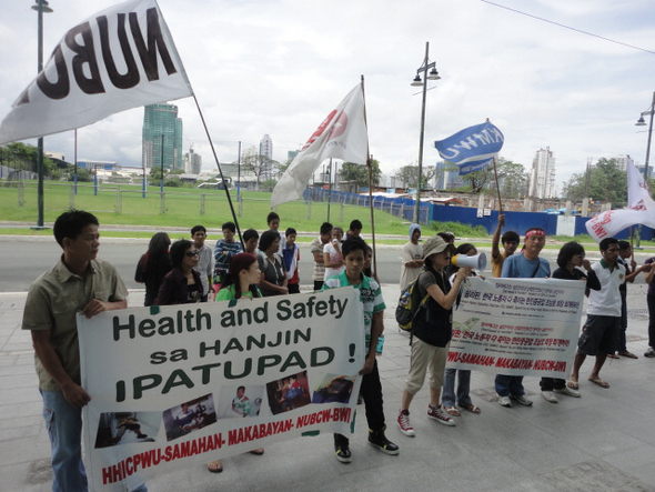필리핀 마닐라의 한진중공업 건물 앞에서 노동·종교단체가 ‘열악한 노동현실을 개선하라’는 시위를 펼치고 있다. 민주노총 전국금속노동조합 제공
