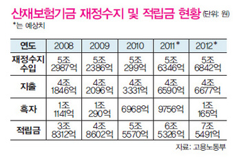 고용노동부가 최근 밝힌 ‘2012 회계연도 산재기금 운용계획’을 보면, 산재보험기금은 2008년 1조1141억원, 2009년 1조290억원, 2010년 6968억원 등 매년 흑자를 기록했다. 올해도 근로복지공단은 9756억원의 흑자를 낼 전망이다. 그러면 적립금이 6조5326억원으로 불어난다. 고용노동부는 산재보험기금이 2011년에도 1조165억원의 흑자를 낼 것으로 예상하고 있다. 그러면 적립금은 7조5491억원으로 는다. 이에 대해 민주노총 최명선 노동안전보건국장은 “근로복지공단이 산업재해 인정폭을 줄이고, 장기 치료가 필요한 산업재해 피해자의 치료를 종료시키면서 돈을 쌓아가고 있는 것”이라고 말했다.