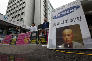 삼성 백혈병 피해자 유가족 황상기(맨 오른쪽)씨 등이 지난 7월14일 서울 영등포 근로복지공단 정문에서 공단이 최근 법원의 산업재해 인정 판결에 불복해 항소를 결정한 것에 항의하는 집회를 열고 있다. 공단의 산업재해 불승인이 많아져 산재보험기금은 매년 1조원가량의 흑자를 내고 있다. 한겨레 류우종