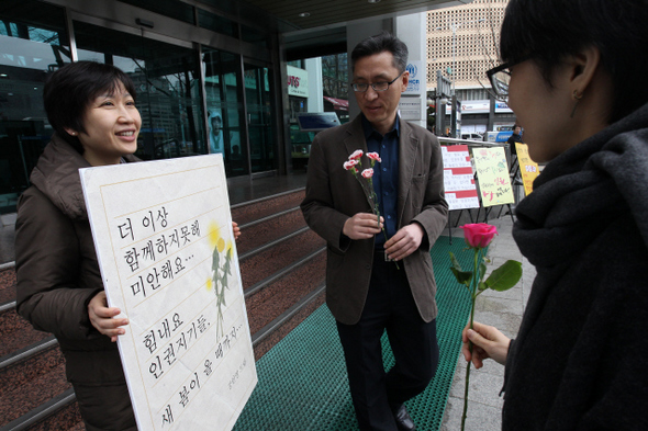 계약 해지된 국가인권위원회 강인영 조사관이 마지막 출근일인 지난 2월28일 인권위 들머리 앞에서 1인시위를 하고 있다. 동료 직원들은 그에게 격려의 꽃을 전달했다. 한겨레 김진수