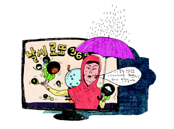 지난주 대한민국은 희대의 ‘날씨 조작 사건’으로 뒤숭숭했다. 지금까지 일기예보와 맞지 않는 갑작스런 호우로 낭패를 본 시민들은 모두 범죄조직의 희생양이었던 것이다. 경찰은 이 사건에 가담한 혐의로 속칭 ‘레인맨’ 일당 12명을 체포했는데, 이들은 조직적인 부정을 통해 ‘날씨 로또 365’에 개입해 수천억원에 이르는 불법적인 이익을 얻었다고 한다. 공범들 중에는 섹시한 외모와 파격적인 의상으로 인기를 모은 기상캐스터 H를 비롯해 전·현직 기상통보관, 일급 해커 등이 포함돼 있어 큰 충격을 주고 있다. 도대체 이 나라에서 어떤 일이 벌어지고 있는 것일까?