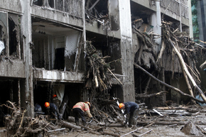 서울지역에 내린 기록적인 폭우가 내려 산사태가 발생한 서울 서초구 방배동 삼성 래미안 방배아트힐에서 27일 오후 중앙119구조단 소방대원들이 구조작업을 하고 있다. 김명진 기자 littleprince@hani.co.kr