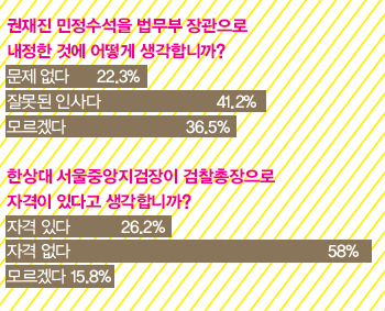 까도 까도 나오는 ‘양파 후보’. 이명박 대통령이 각각 법무부 장관과 검찰총장에 내정한 권재진 청와대 민정수석과 한상대 서울중앙지검장을 두고서 나오는 말이다. <한겨레21>과 여론조사전문기관 TNS가 전국 1천 명에게 물은 결과, ‘문제 있다’는 응답이 많았다. 권재진 후보에 대해서는 41.2%가 ‘잘못된 인사’라고 밝혔고, 한상대 후보에 대해서는 58%가 ‘자격 없다’고 답했다.