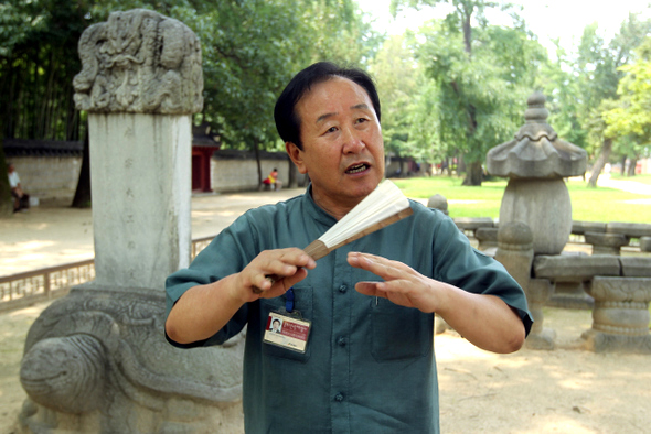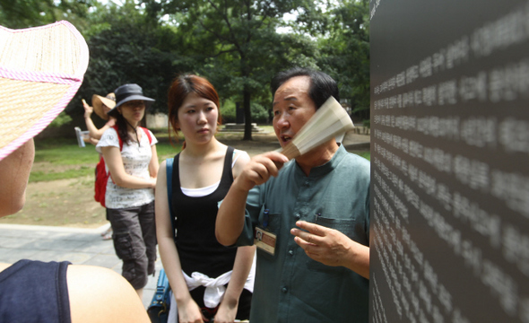 와글와글, 가족들이 모여드는 박물관의 일요일은 분주하다. 김종대씨는 그들에게 먼저 다가가 유물들의 숨은 이야기를 들려주고, 그들과 친구가 되기를 주저하지 않는다. 지난 8월3일 오후 김종대 전주시 문화유산해설사가 경기전 안에 있는 예종대왕 태실 앞에서 관광객을 대상으로 문화해설을 하고 있다. 한겨레21 이종찬 선임기자