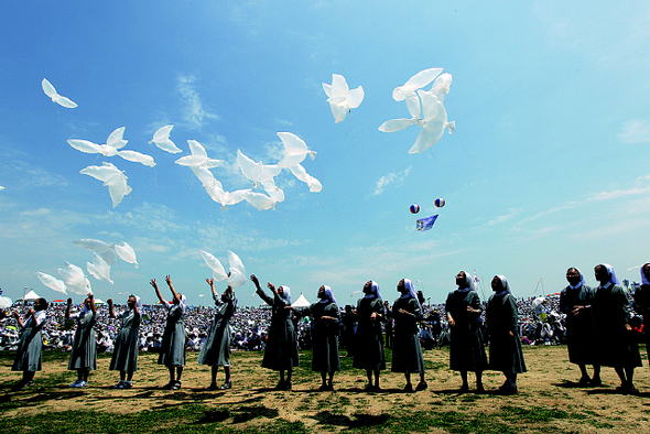 그러다 비행기처럼 하늘에 있는 사물을 떠올려본다. 나에게 지금 잠시라도 필요한 건 평화의 이미지다. 하늘에서 일어나는 일들은 지금 같은 어둠과 불안만이 아니라는 걸 기억해야 한다. 하늘에는 투명한 구름도, 빛도 있으니까. 여기에 더해 평화 기원의 임무를 맡고 하늘로 발사된 수많은 사물들도 있다. UFO와 전투기도 때로는 ‘평화’ 프로젝트로 포장되지만 일단 작고 위태로운 사물부터 생각하고 싶다. 신문에서 본 비둘기 풍선은 어떨까. 지난 6월 중순 한국천주교 주교회의는 경기도 파주 임진각 평화누리 공원에서 비둘기 모양의 풍선을 하늘로 올려보냈다. 회색 옷을 입은 수녀들이 비둘기 모양의 풍선을 날려보내는 동작은 어린아이들이 비눗방울 놀이를 하는 듯 들떠 보였다. 남북평화를 기원하는 손짓에 풍선, 그러니까 가짜 비둘기들은 푸드덕 하늘을 날았다. 마치 진짜 새라도 되는 양.