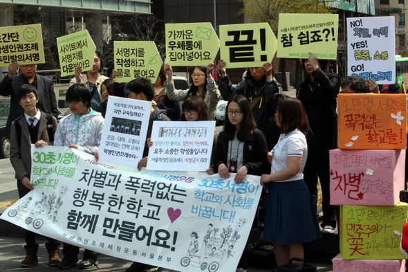 지난 4월19일 오전 서울 청계광장에서 학생인권조례제정운동 서울본부 학생들이 지나가는 시민들에게 서울학생인권조례 주민발의 동참을 호소하고 있다. 한겨레 김태형
