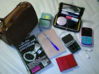 지금은 노력해 많이 줄였지만 일단 매일 챙기게 되는 것이 블랙베리와 충전기, 아이팟, 작은 주머니 지갑(현관 카드키, 주 사용 체크카드, 교통카드, 현금, 가족과 친구 사진), 거울 달린 화장품 주머니(립틴트, 블러셔, 립밤)다.