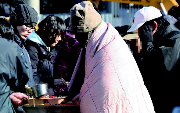 2008년 크리스마스를 맞아 서울역 앞에서 한 교회 사람들이 노숙인들에게 음식을 나눠주고 있다. 한겨레 신소영 기자