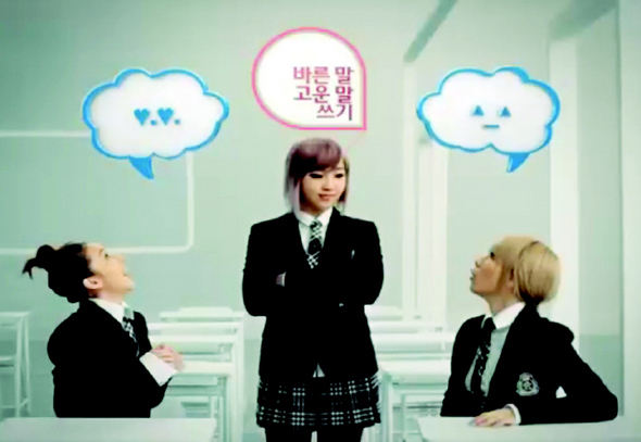 법무부 법질서 캠페인 광고에 등장한 2NE1 멤버들이 ‘친구들과 사이좋게 지내’는 법을 연기하고 있다.